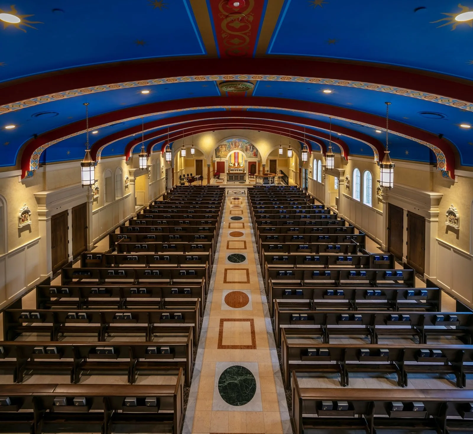 Mass is celebrated ad orientem in the beautifully and imaginatively restored adjacent parish church and this is at the heart of the school life. There is an article on the restoration in the Liturgical Arts Journal.